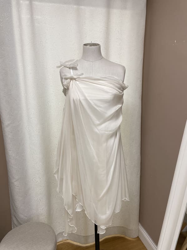 Robe courte, drapée, en mousseline de soie. Détail fleuri à l’épaule