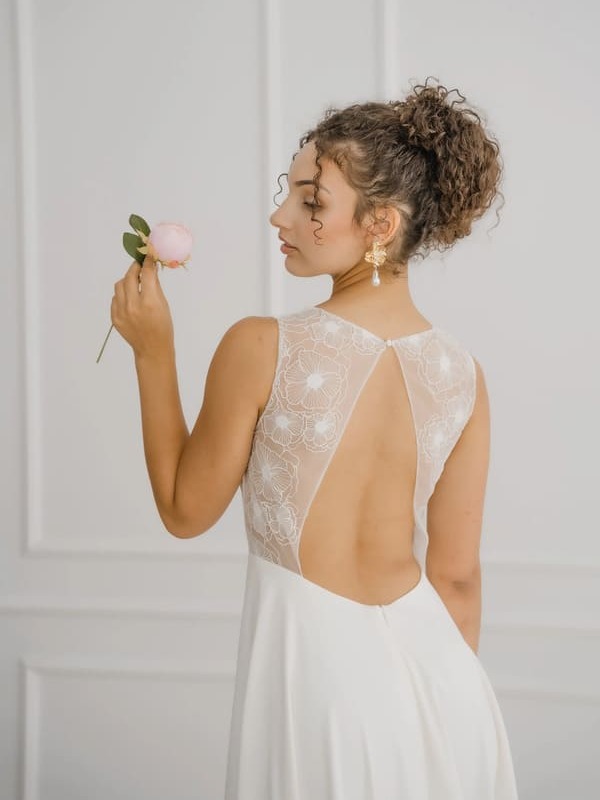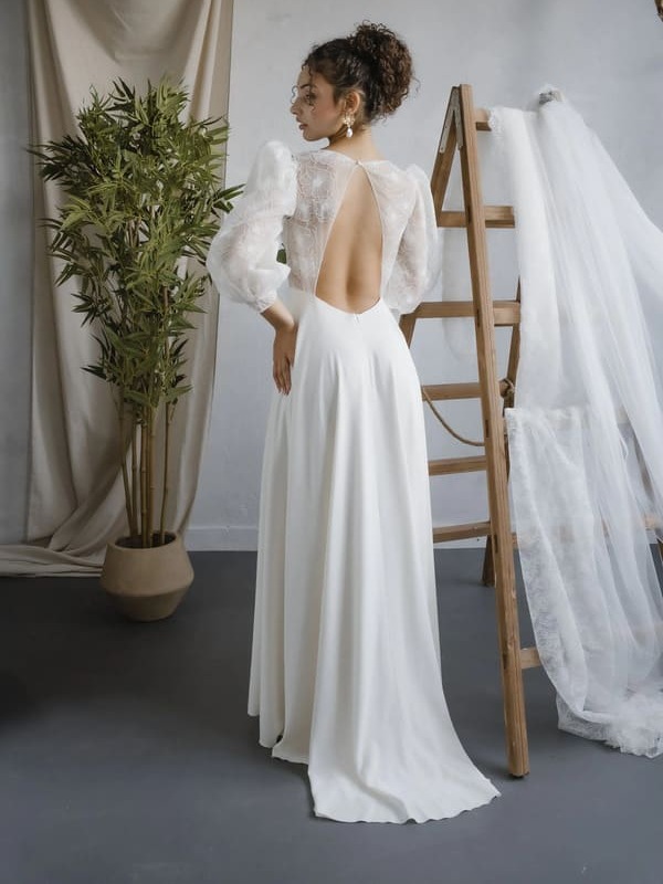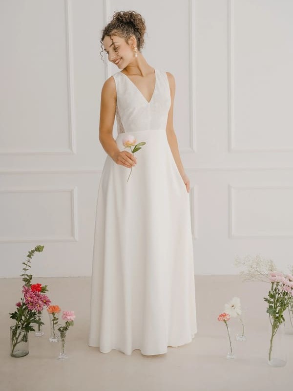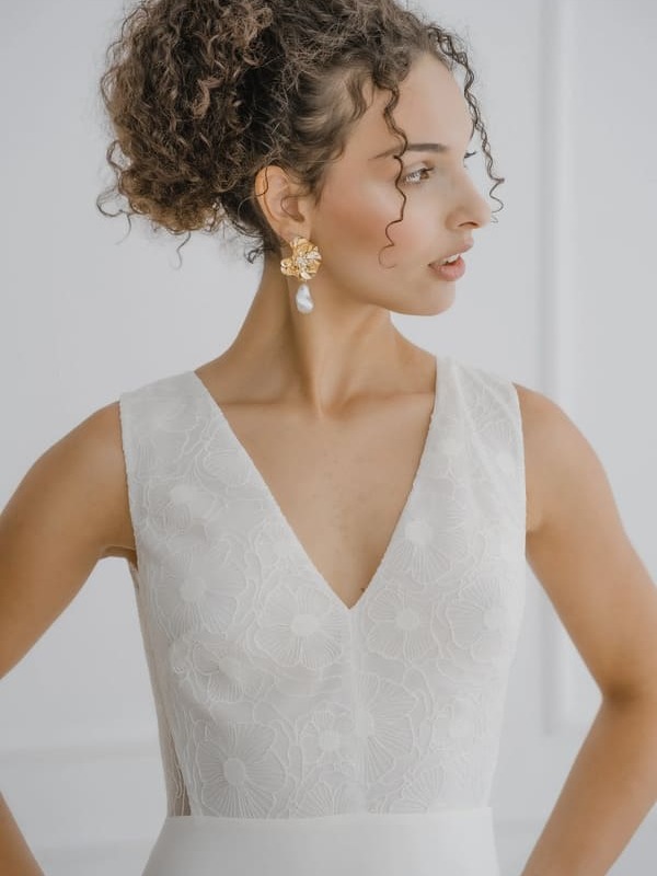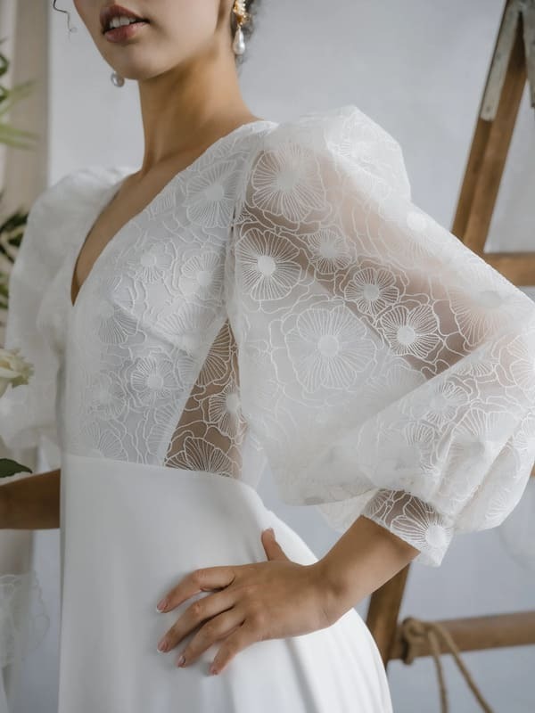 Robe de mariée en crêpe et buste en tulle brodé de fleurs. délicates. Les manches bouffantes, légères et amovibles, permettent de moduler la silhouette entre modernité et romantisme.
