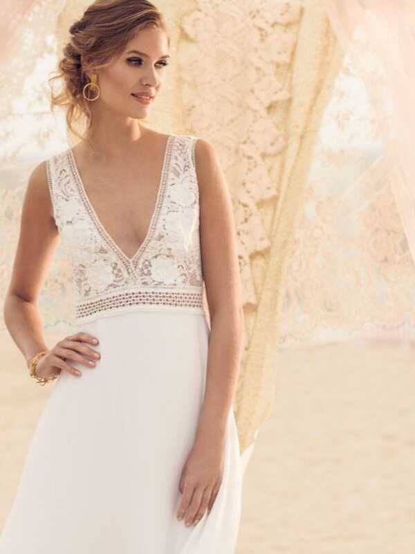 Robe au décolleté profond, avec un top en guipure florale et marqué par une ceinture graphique. Le style Rembo!
